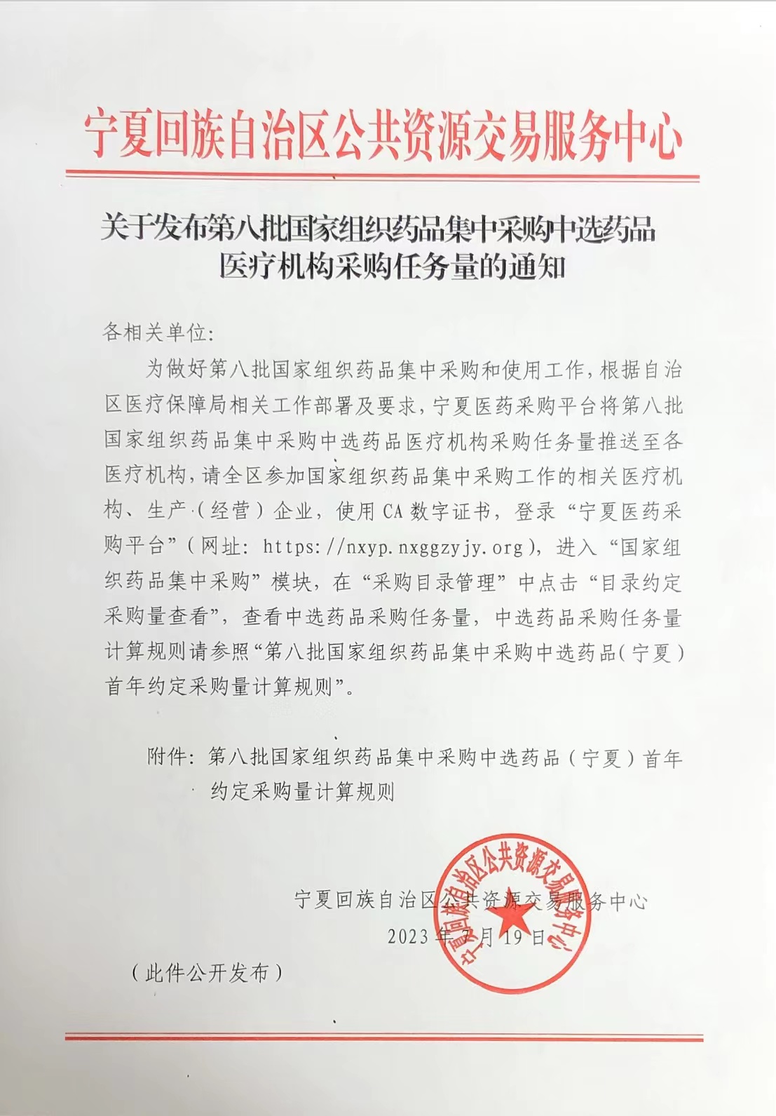 为做好第八批国家组织药品集中采购和使用工作,根据自治区医疗保障局相关工作部署及要求,宁夏医药采购平台将第八批国家组织药品集中采购中选药品医疗机构采购任务量推送至各医疗机构,请全区参加国家组织药品集中采购工作的相关医疗机构、生产(经营)企业,使用CA数字证书,登录“宁夏医药采购平台”(网址:https://nxyp.nxggzyjy.org),进入“国家组织药品集中采购”模块,在“采购目录管理”中点击“目录约定采购量查看”,查看中选药品采购任务量,中选药品采购任务量计算规则请参照“第八批国家组织药品集中采购中选药品(宁夏)首年约定采购量计算规则”。