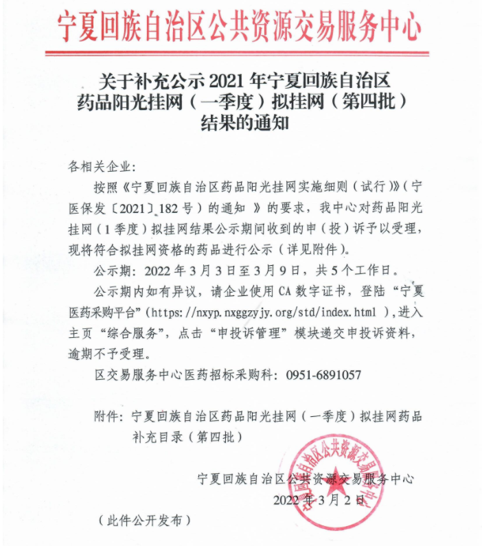 【宁夏】关于补充公示2021年宁夏回族自治区药品阳光挂网(一季度)拟挂网(第四批) 结果的通知
