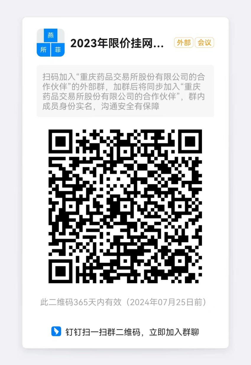 8月1日上午10:00将举行限价挂网药品价格定期调整报价操作在线培训会,请相关卖方会员提前下载钉钉APP,扫描二维码入群。