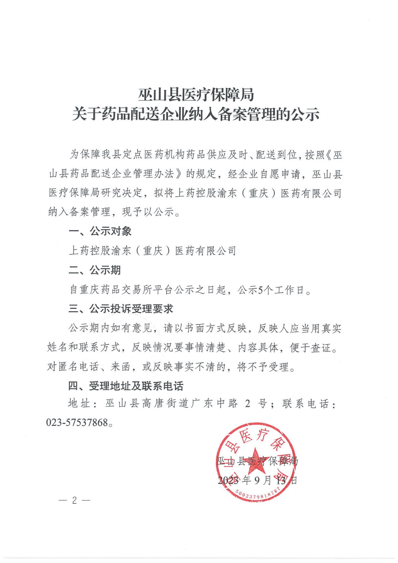 【重庆】重庆市巫山县医疗保障局关于药品配送企业纳入备案管理的公示(20230914)