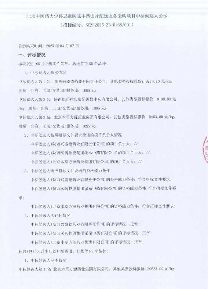 【北京中医药大学孙思邈医院】北京中医药大学孙思邈医院中药饮片配送服务采购项目中标候选人公示