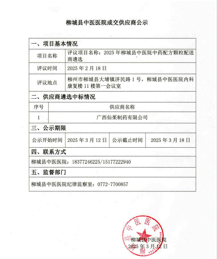 【柳州市柳城县中医医院】广西壮族自治区柳州市柳城县中医医院遴选医院中药配方颗粒配送服务项目成交供应商公示