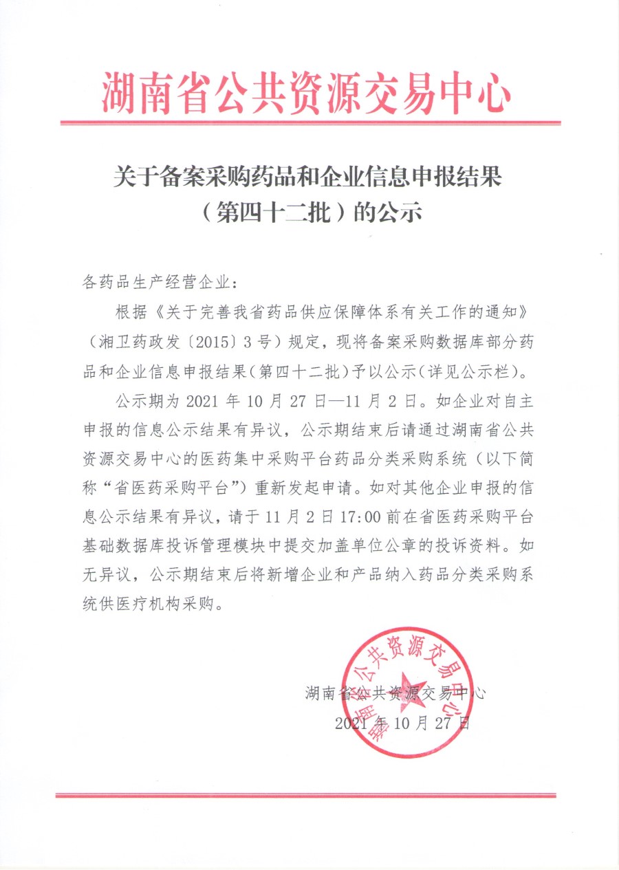 【湖南】2021年湖南省关于备案采购药品和企业信息申报结果(第四十二批)的公示