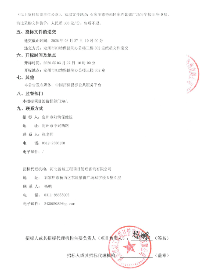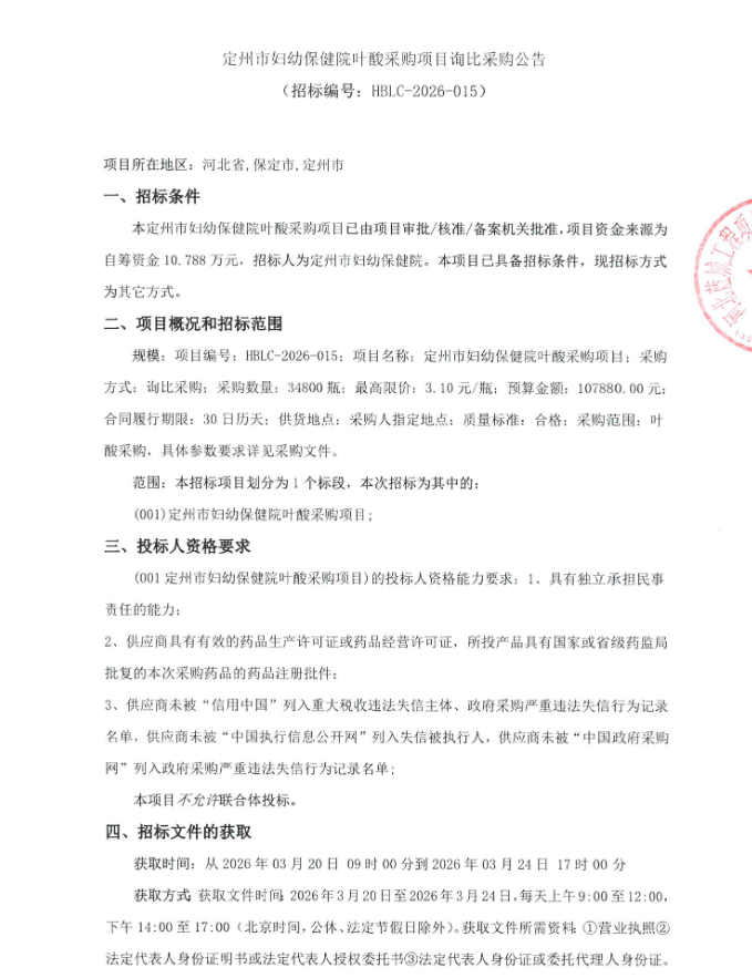 【保定市定州市妇幼保健院】河北省定州市妇幼保健院叶酸采购项目询比采购公告