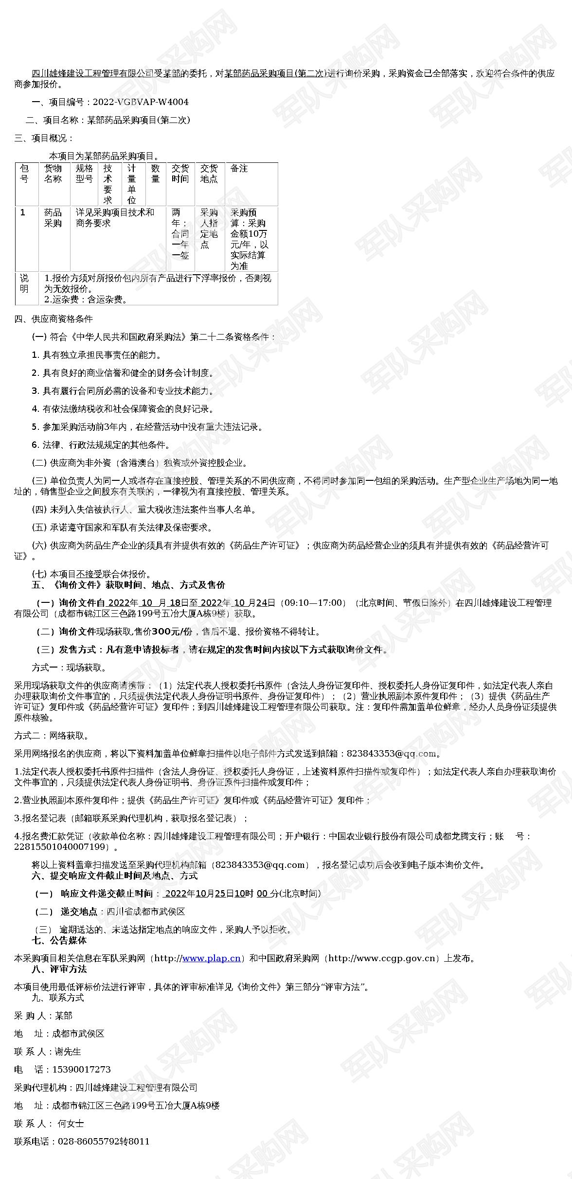 【军队采购网】某部药品采购项目(第二次)采购公告(2022-VGBVAP-W4004)
