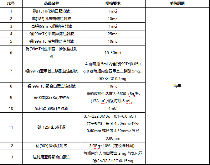 2.投标单位必须提供营业执照、放射性药品生产许可证、放射性药品经营许可证、辐射安全许可证、代理产品授权书、药品注册证、药品说明书、药品外包装扫描件、质量标准、质检报告;