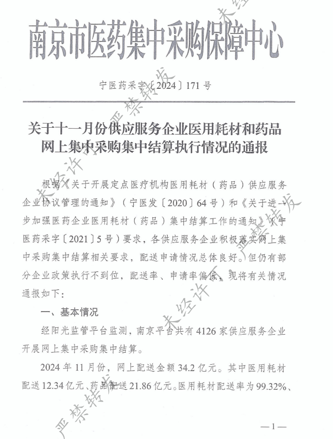 经阳光监管平台监测,南京平台共有4126家供应服务企业开展网上集中采购集中结算。2024年11月份,网上配送金额34.2亿元。其中医用耗材配送12.34亿元、药品配送21.86亿元。医用耗材配送率为99.32%、药品配送率为91.41%;医用耗材申请率为94.72%、药品申请率为88.26%。