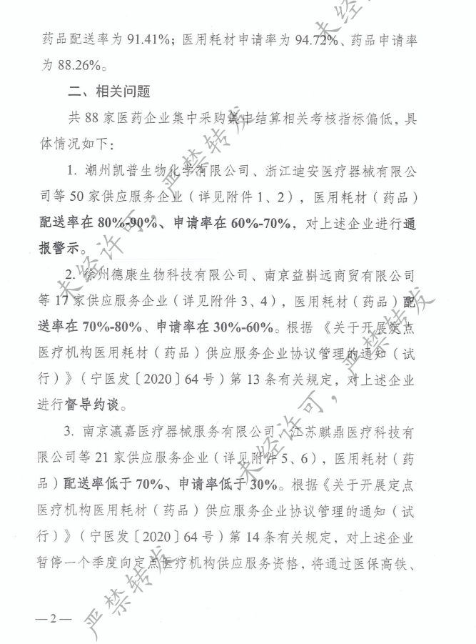 1.潮州凯普生物化学有限公司、浙江迪安医疗器械有限公司等50家供应服务企业(详见附件1、2),医用耗材(药品)配送率在80%-90%、申请率在60%-70%,对上述企业进行通报警示。