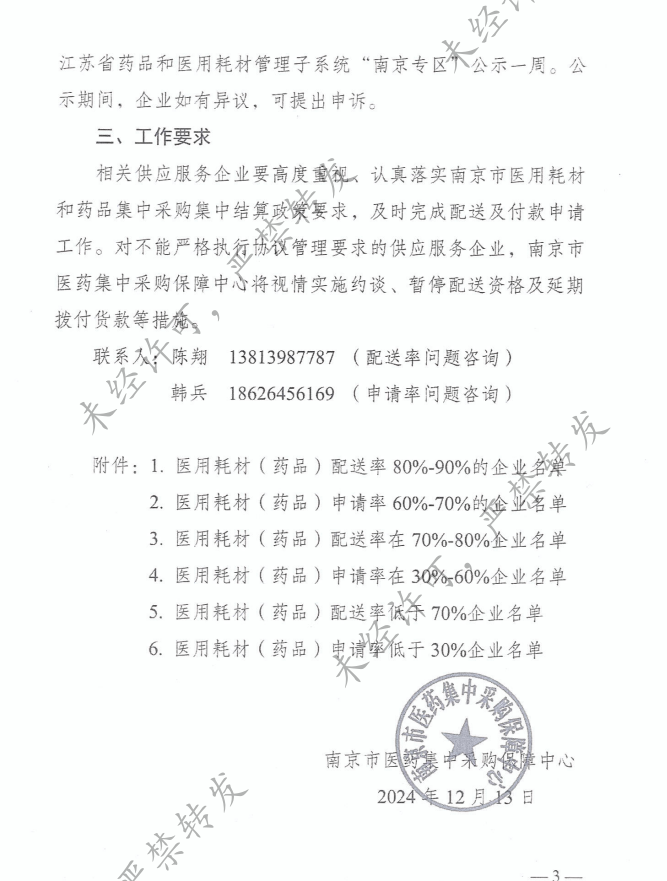 相关供应服务企业要高度重视、认真落实南京市医用耗材和药品集中采购集中结算政策要求,及时完成配送及付款申请工作。对不能严格执行协议管理要求的供应服务企业,南京市医药集中采购保障中心将视情实施约谈、暂停配送资格及延期拨付货款等措施。
