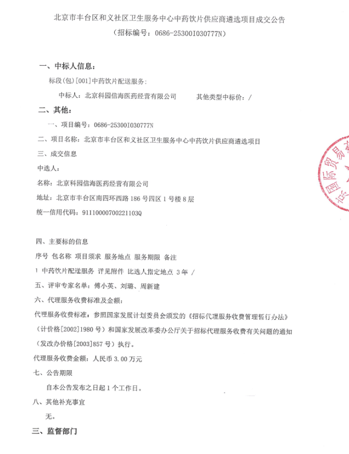 【北京市丰台区和义社区卫生服务中心】北京市丰台区和义社区卫生服务中心中药饮片供应商遴选项目成交公告