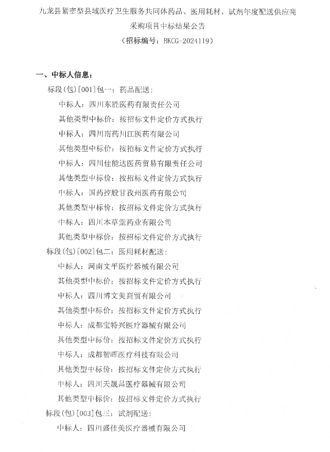 【甘孜藏族自治州九龙县人民医院】四川省甘孜藏族自治州九龙县紧密型县域医疗卫生服务共同体药品、医用耗材、试剂年度配送供应商采购项目中标结果公告