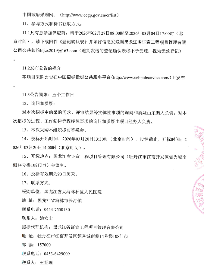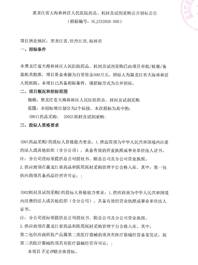 【牡丹江市大海林林区人民医院】黑龙江省大海林林区人民医院药品、耗材及试剂采购公开招标公告