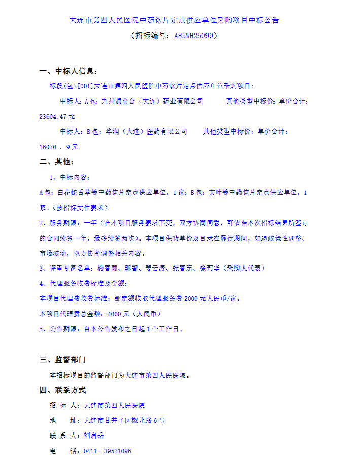 【大连市第四人民医院】辽宁省大连市第四人民医院中药饮片定点供应单位采购项目中标公告