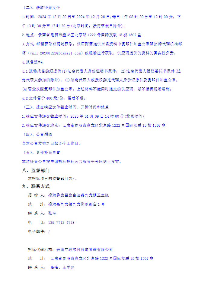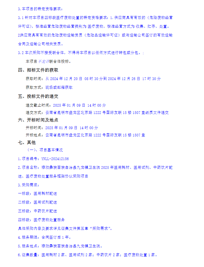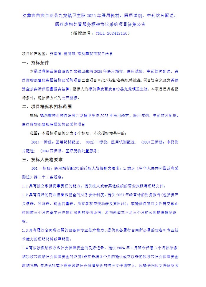 【昆明市劝彝族苗族自治县九龙镇卫生院】云南省昆明市劝彝族苗族自治县九龙镇卫生院2025年医用耗材、医用试剂、中药饮片配送、医疗废物处置服务框架协议采购项目征集公告