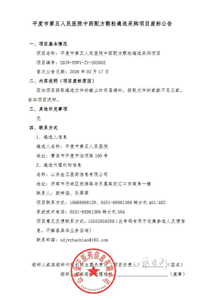 【青岛市平度市第五人民医院】山东省平度市第五人民医院中药配方颗粒遴选采购项目废标公告