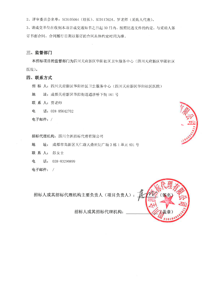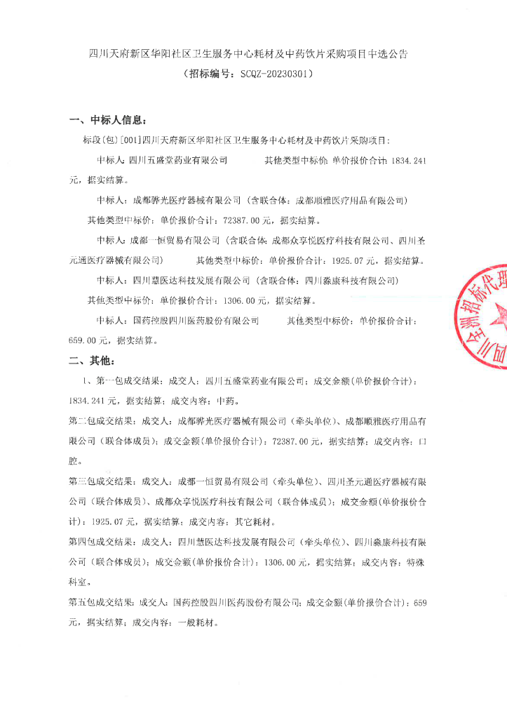 【成都天府新区华阳社区卫生服务中心】四川天府新区华阳社区卫生服务中心耗材及中药饮片采购项目中选公告