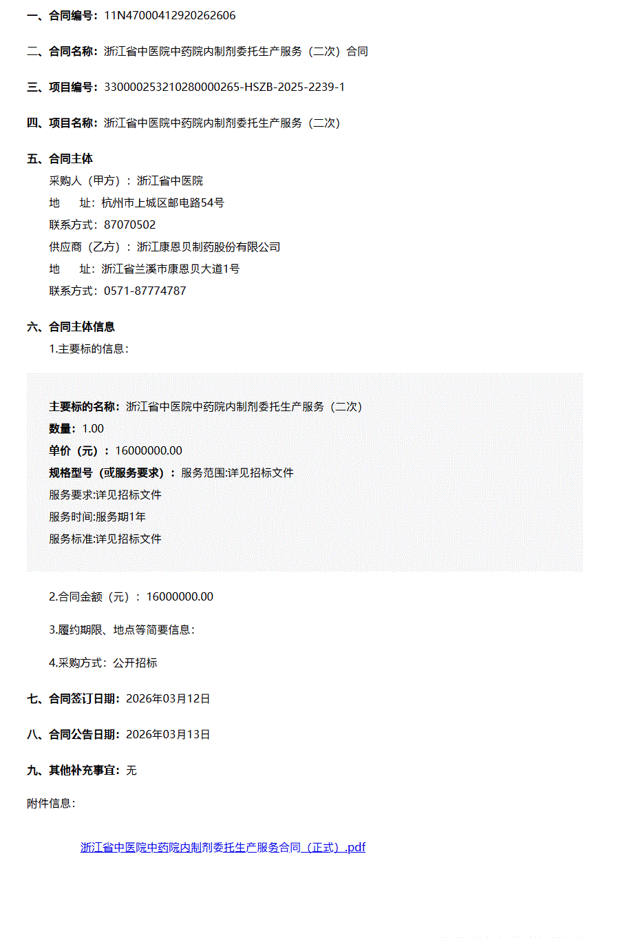 【浙江省中医院】浙江省中医院中药院内制剂委托生产服务(二次)合同公告