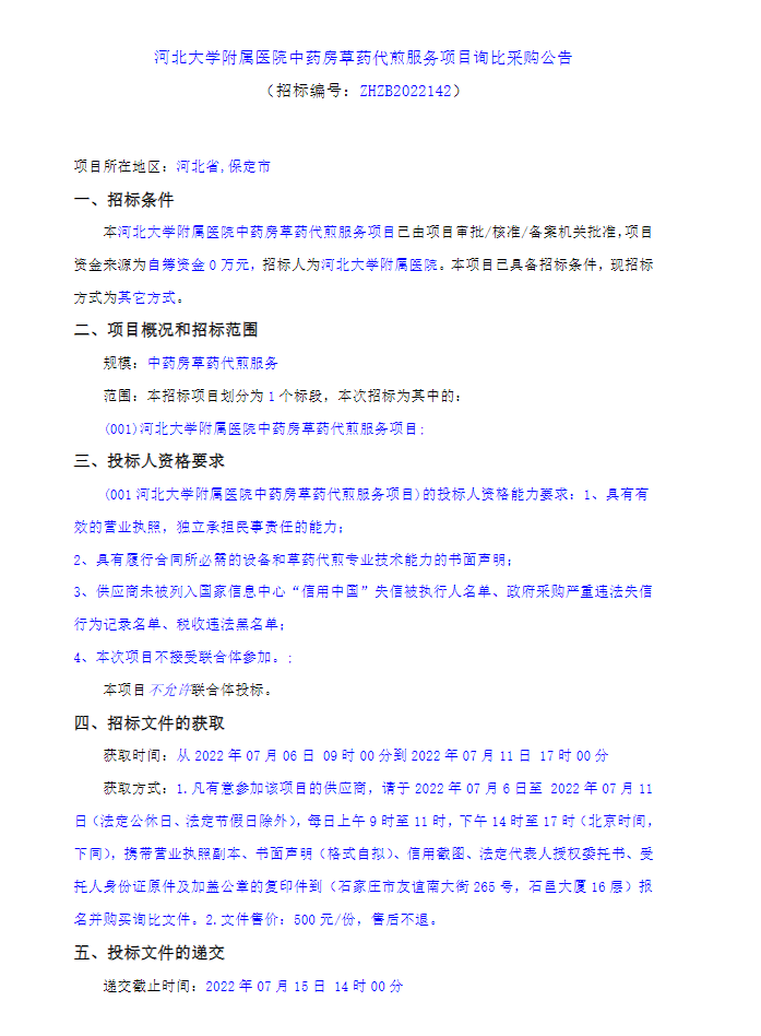 【河北大学附属医院】河北大学附属医院中药房草药代煎服务询比采购公告