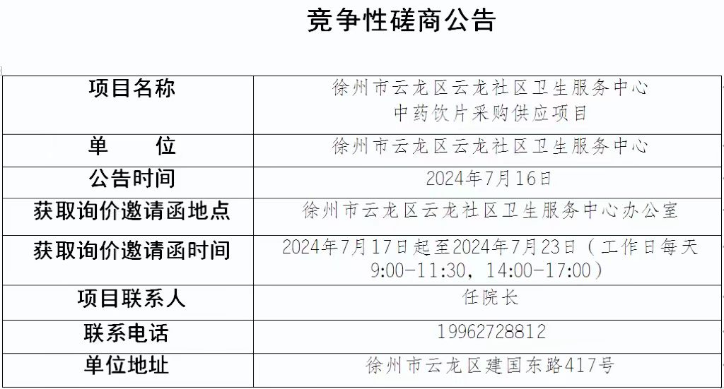 【徐州市云龙区云龙社区卫生服务中心】江苏省徐州市云龙区云龙社区卫生服务中心中药饮片采购供应项目竞争性磋商公告