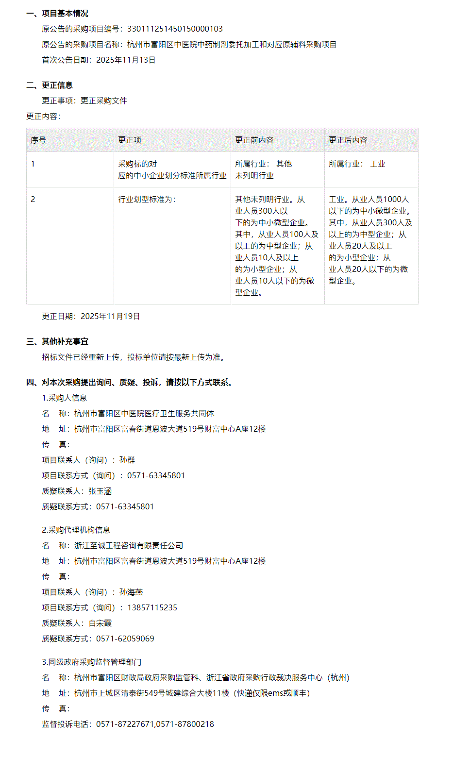 【杭州市富阳区中医院】浙江至诚工程咨询有限责任公司关于杭州市富阳区中医院中药制剂委托加工和对应原辅料采购项目的更正公告