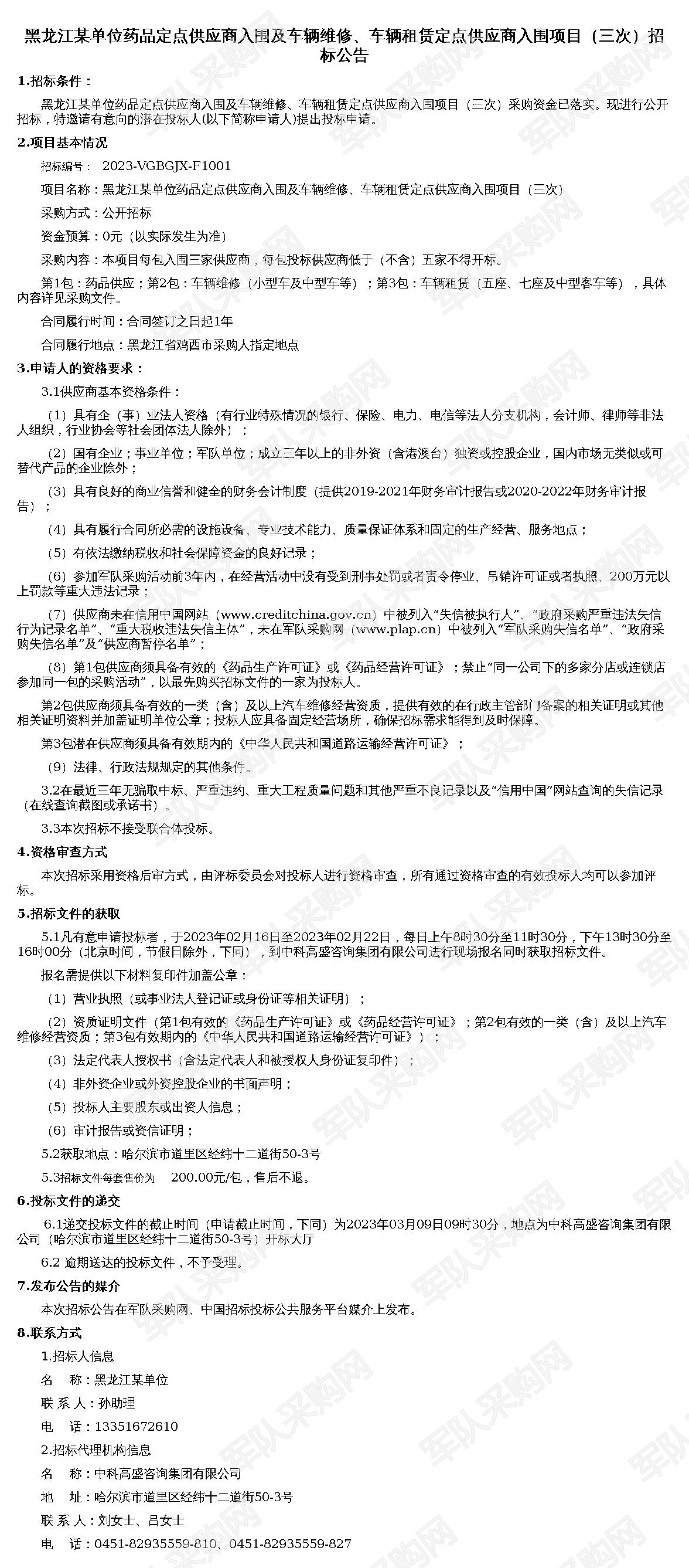 【黑龙江某单位】军队采购网黑龙江某单位药品定点供应商入围及车辆维修、车辆租赁定点供应商入围项目(三次)招标公告2023-VGBGJX-F1001