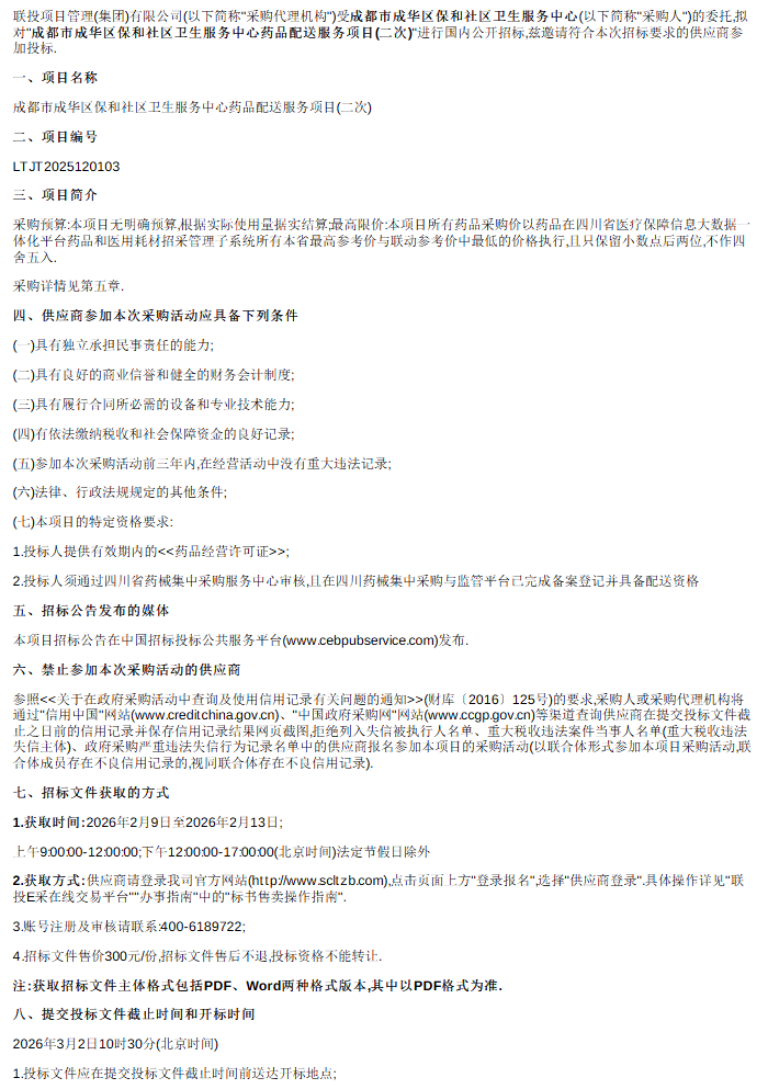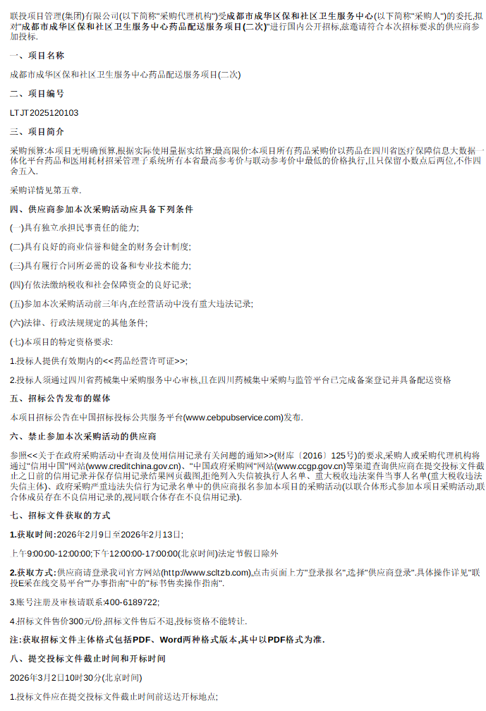 【成都市成华区保和社区卫生服务中心】四川省成都市成华区保和社区卫生服务中心药品配送服务项目(二次)公开招标采购公告