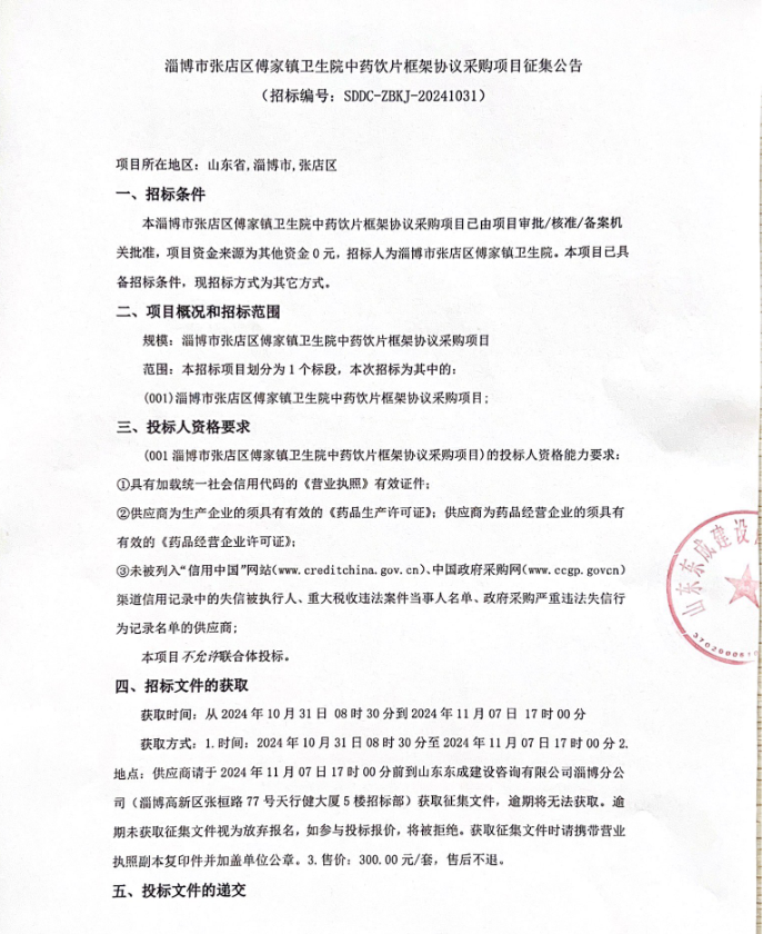 【淄博市张店区傅家镇卫生院】山东省淄博市张店区傅家镇卫生院中药饮片框架协议采购项目征集公告(20241031)