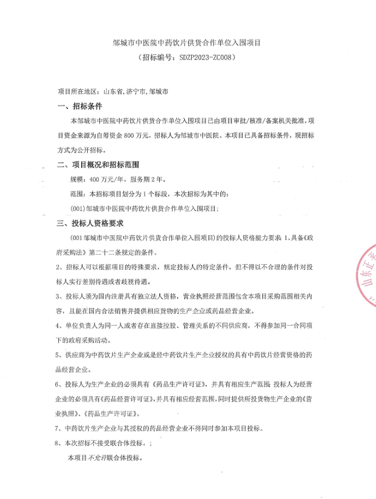 【邹城市中医院】山东省济宁市邹城市中医院中药饮片供货合作单位入围项目
