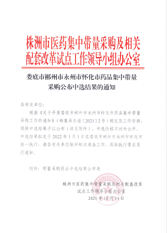 【株洲】湖南省娄底市郴州市永州市怀化市药品集中带量采购公布中选结果的通知