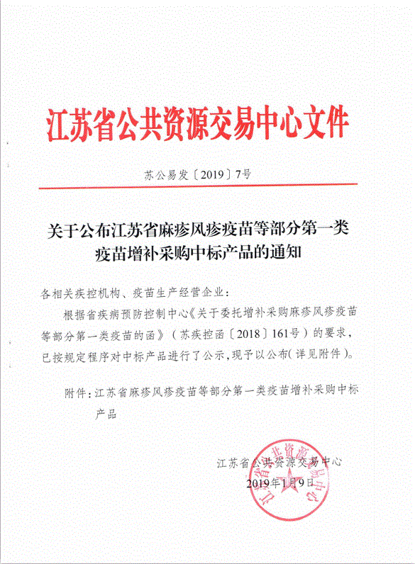 【江苏】2019年江苏省关于公布江苏省麻疹风疹疫苗等部分第一类疫苗增补采购拟中标产品的通知