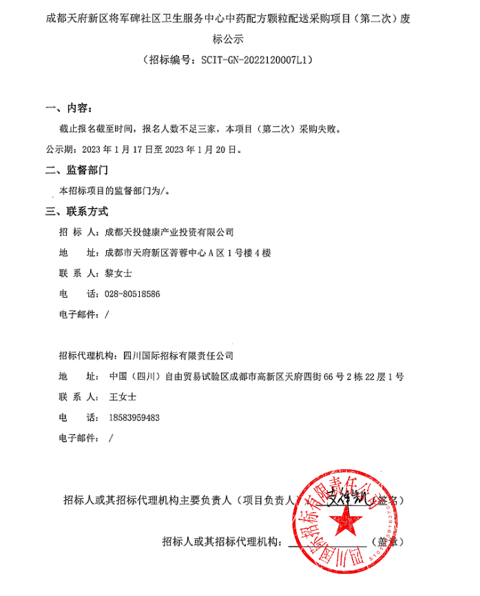 【成都天府新区将军碑社区卫生服务中心】四川省成都天府新区将军碑社区卫生服务中心中药配方颗粒配送采购项目(第二次)废标公示