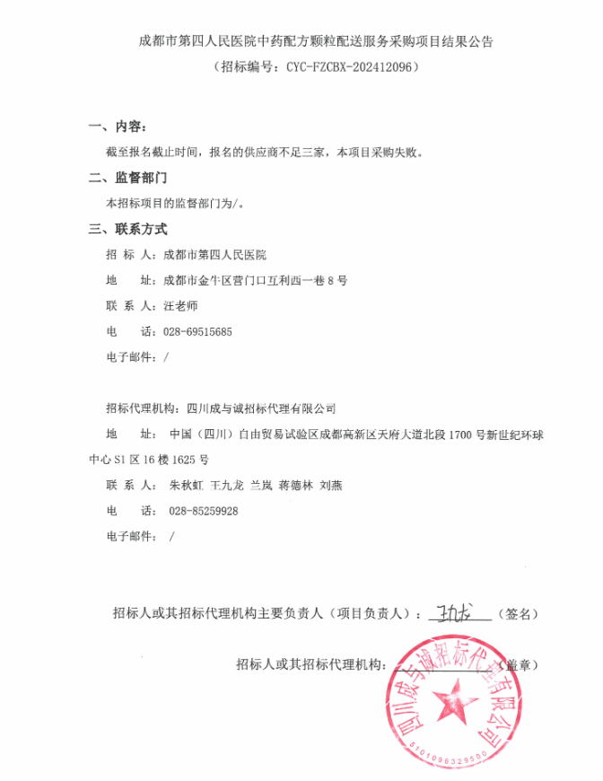 【成都市第四人民医院】四川省成都市第四人民医院中药配方颗粒配送服务采购项目结果公告