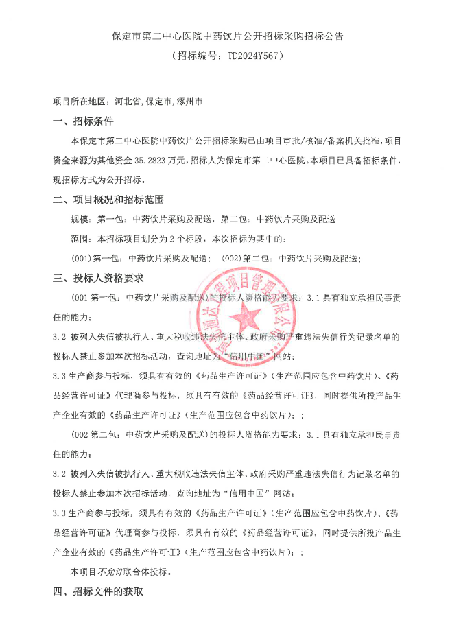 【保定市第二中心医院】河北省保定市第二中心医院中药饮片公开招标采购招标公告