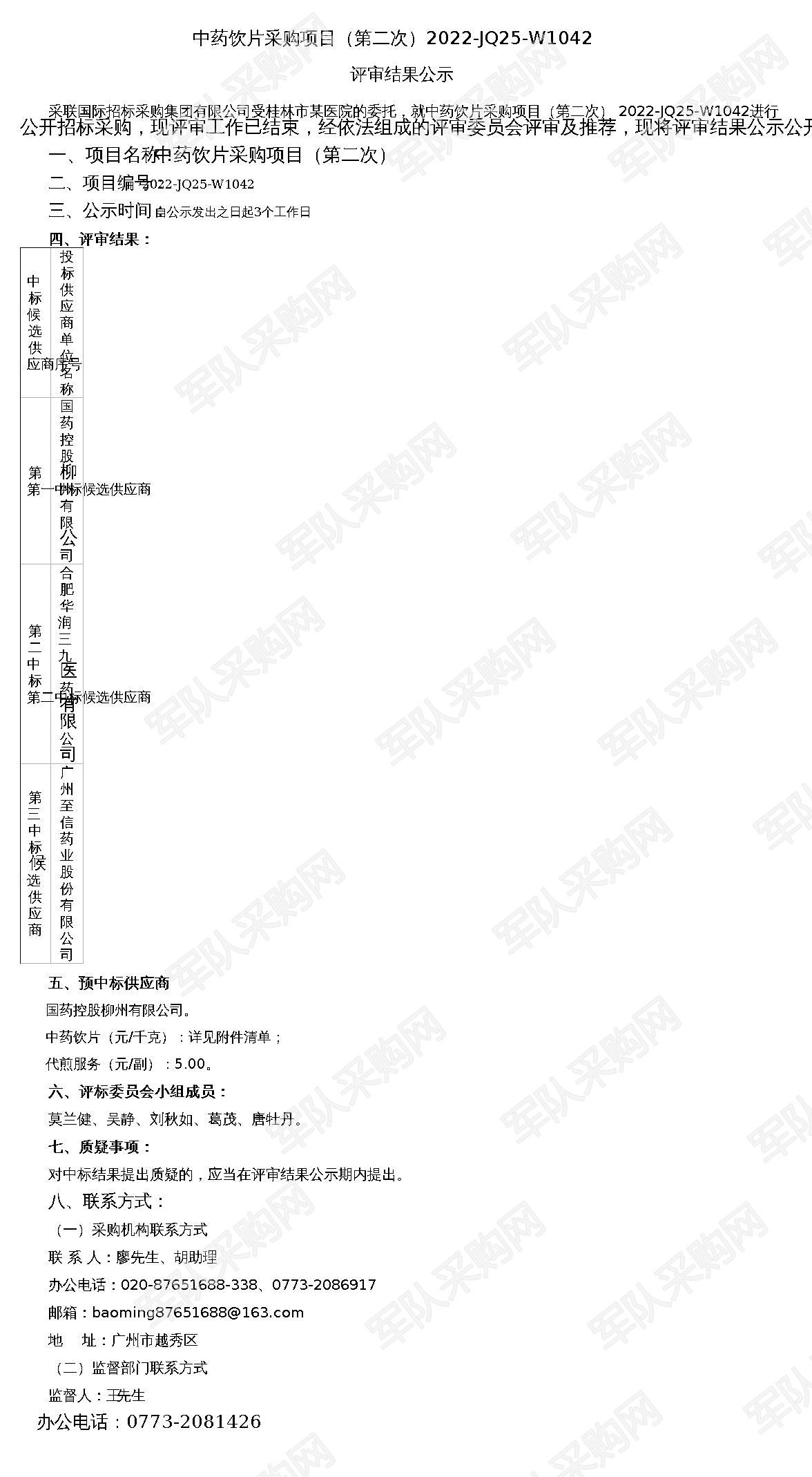 【军队采购】军队采购网中药饮片采购项目(第二次)评审结果公示(2022-JQ25-W1042)