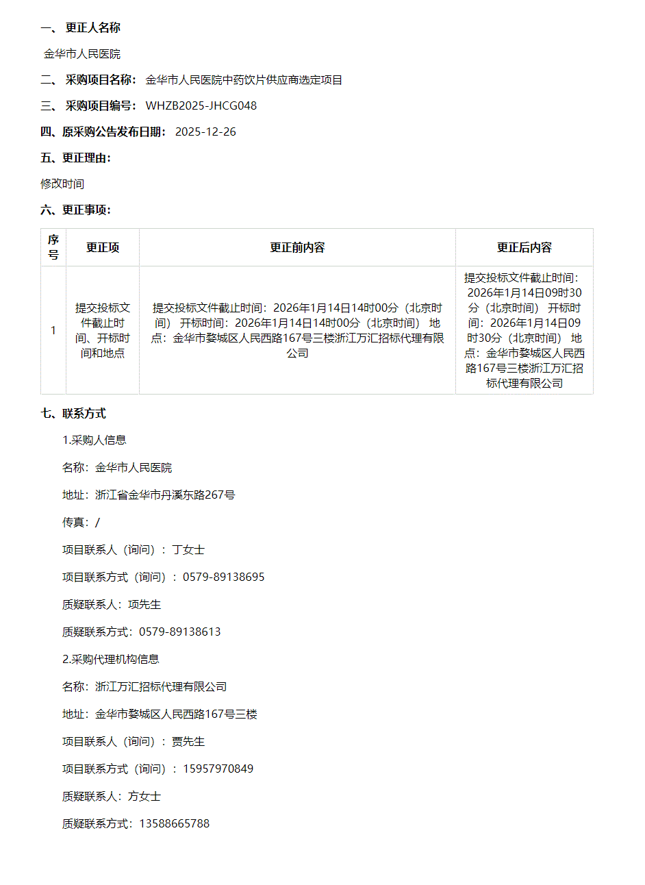 【金华市人民医院】浙江万汇招标代理有限公司关于金华市人民医院中药饮片供应商选定项目的更正公告