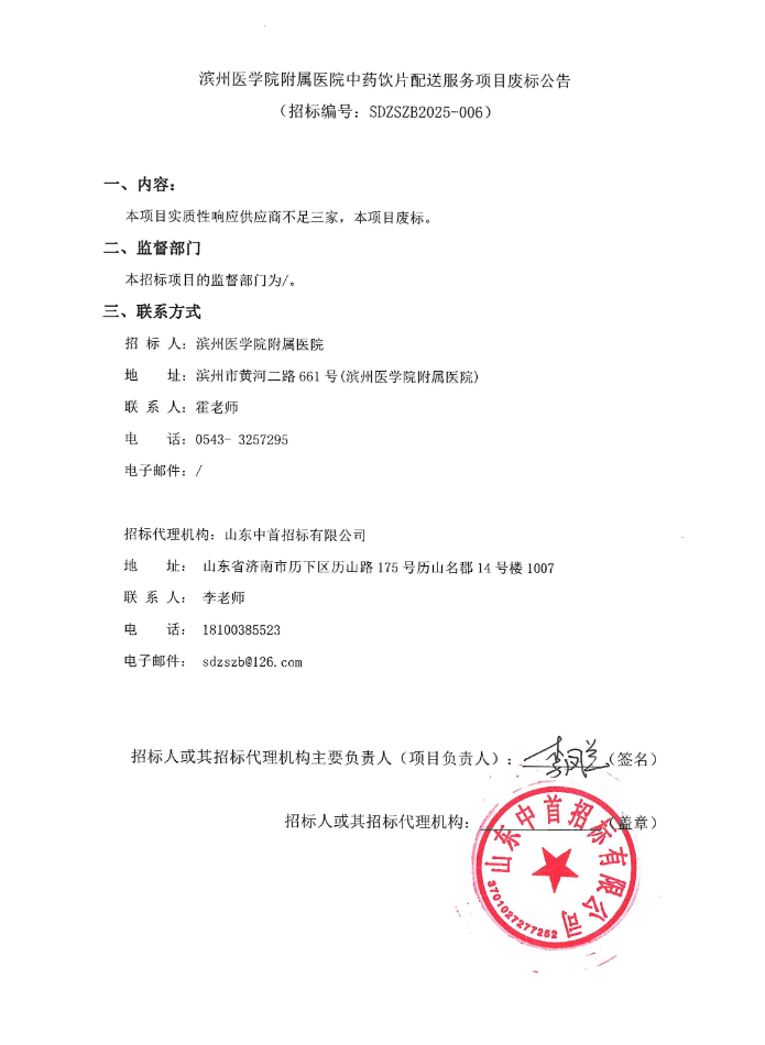 【滨州医学院附属医院】山东省滨州医学院附属医院中药饮片配送服务项目废标公告