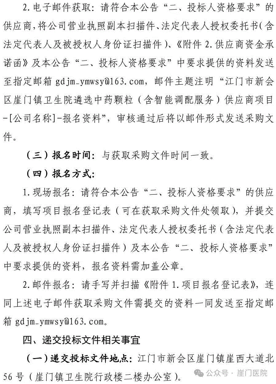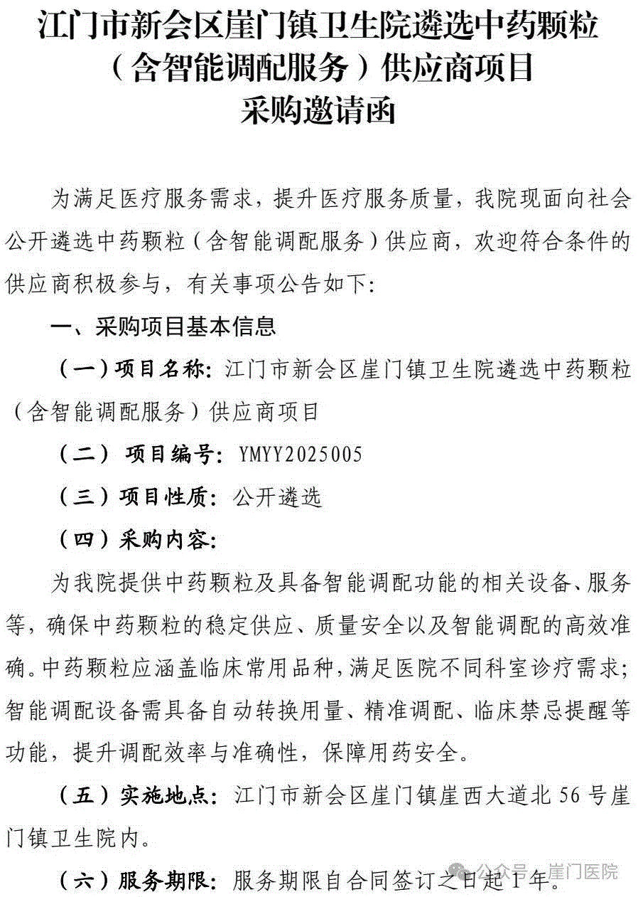 【江门市新会区崖门镇卫生院】广东省江门市新会区崖门镇卫生院遴选中药颗粒(含智能调配服务)供应商项目采购邀请函