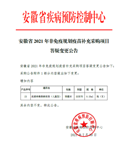 【安徽】2021年安徽省2021年非免疫规划疫苗补充采购项目答疑变更公告