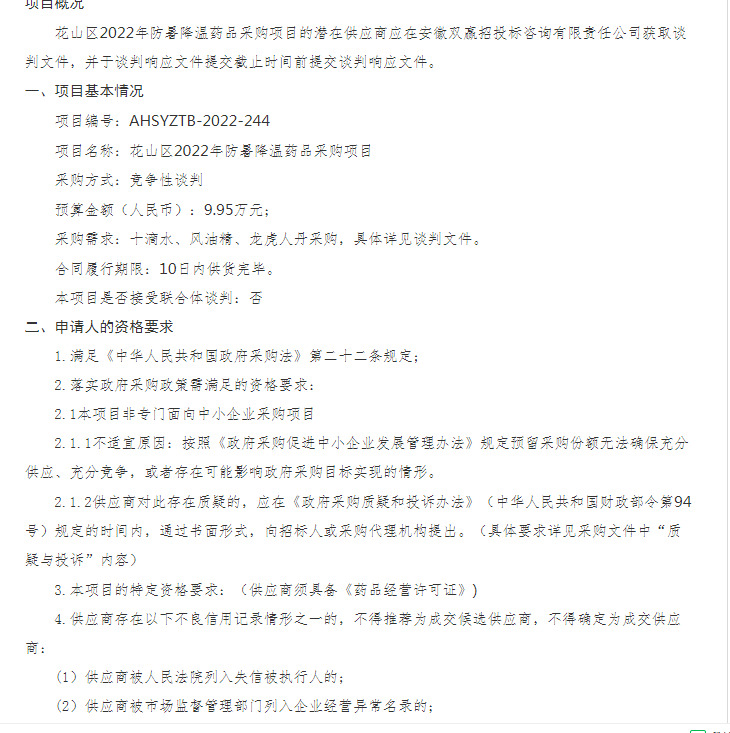 【马鞍山人民办公室】安徽省马鞍山市花山区2022年防暑降温药品采购项目竞争性谈判公告(AHSYZTB-2022-244)