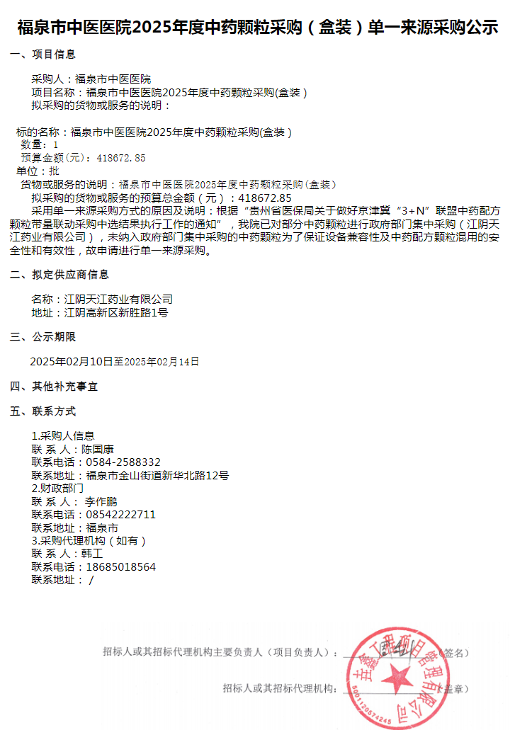 【黔南布依族苗族自治州福泉市中医医院】贵州省黔南布依族苗族自治州福泉市中医医院2025年度中药颗粒采购(盒装)单一来源采购公示(20250209)