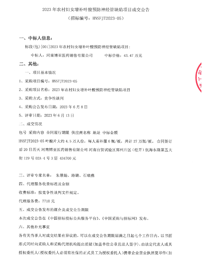 【开封市卫生健康委员会】河南省开封市卫生健康委员会2023年农村妇女增补叶酸预防神经管缺陷项目成交公告