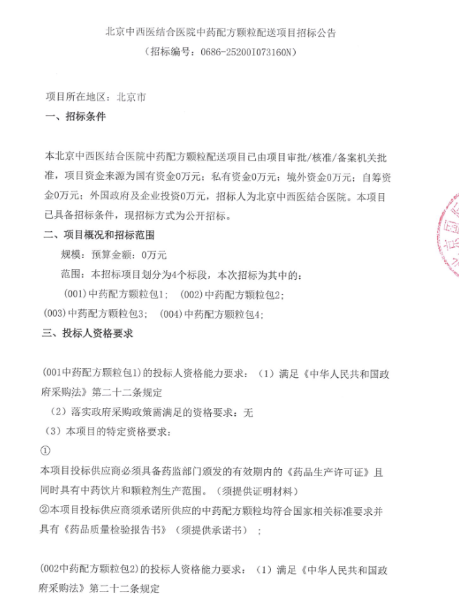 【北京中西医结合医院】北京中西医结合医院中药配方颗粒配送项目招标公告