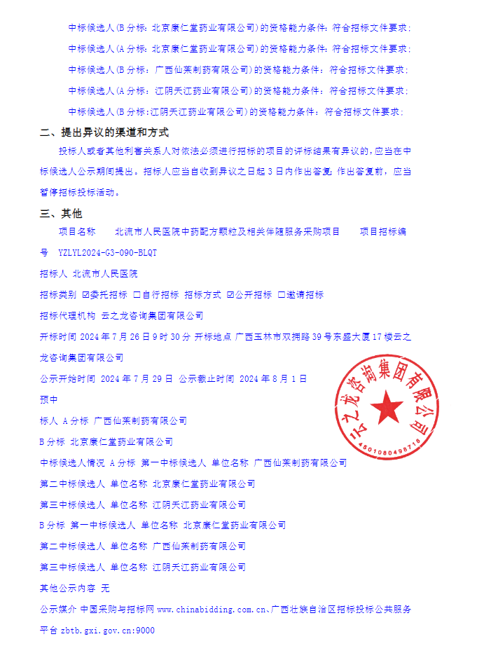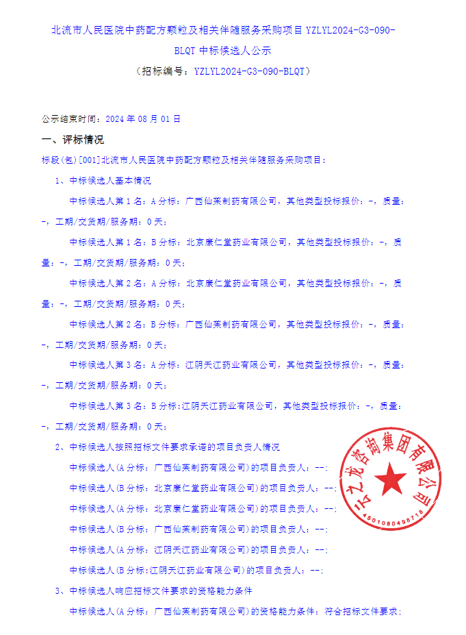 【玉林市北流市人民医院】广西壮族自治区玉林市北流市人民医院中药配方颗粒及相关伴随服务采购项目YZLYL2024-G3-090-BLQT中标候选人公示