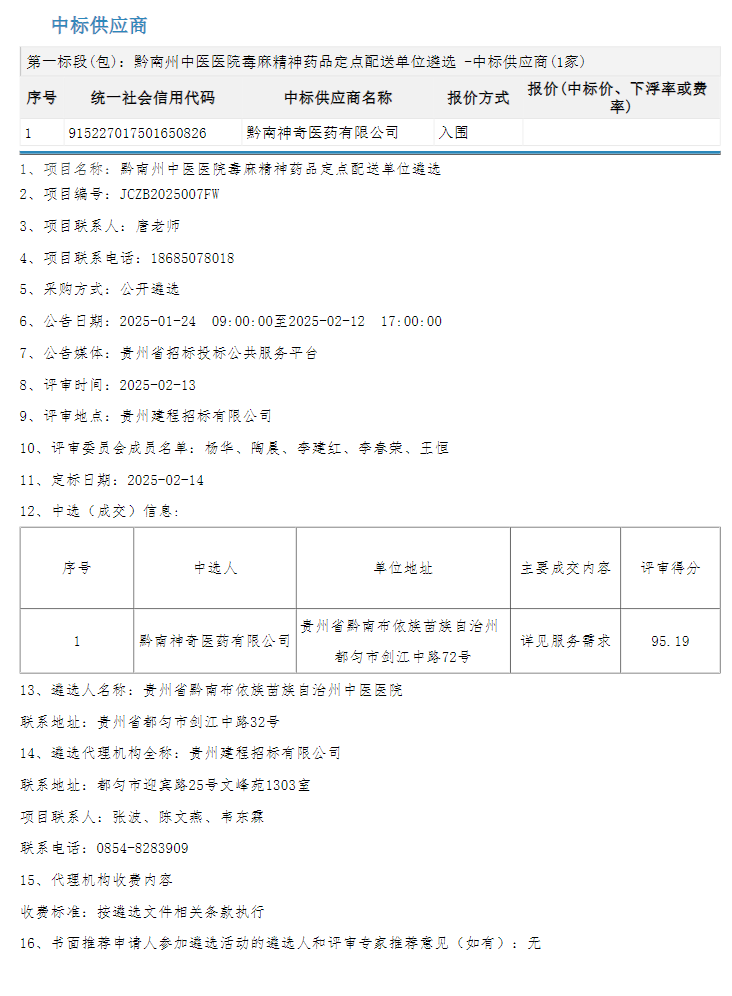 【黔南州中医医院】贵州省黔南州中医医院毒麻精神药品定点配送单位遴选结果公告