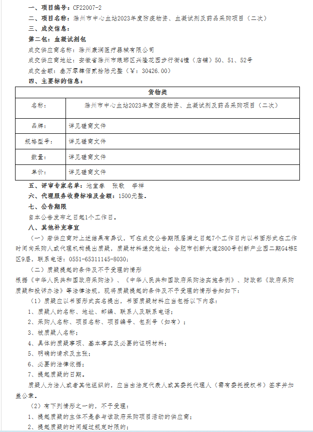 【安徽省滁州市中心血站】2023年度防疫物资、血凝试剂及药品采购项目(二次)第二包:血凝试剂包成交公告