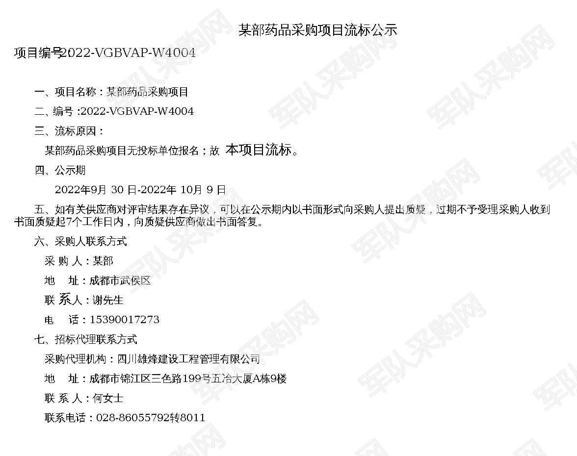 【军队采购网某部】药品采购项目流标公示 (2022-VGBVAP-W4004 )