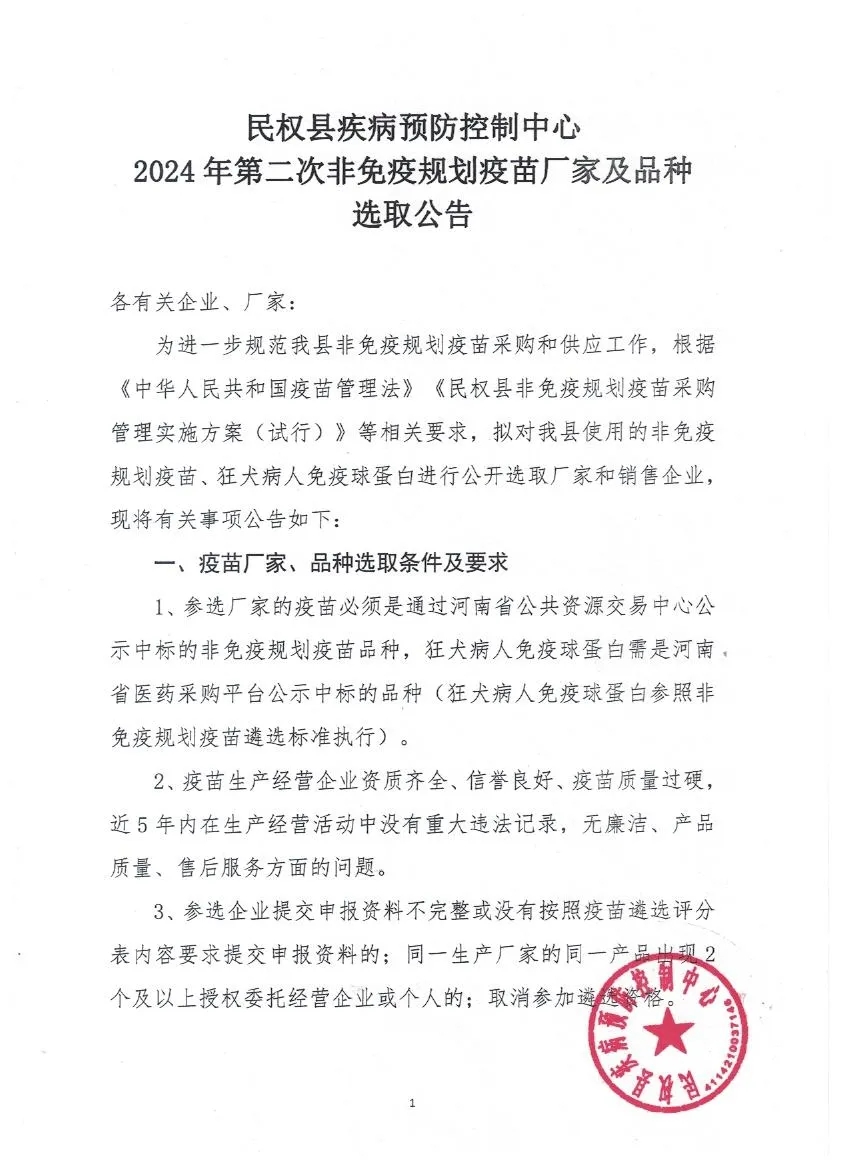 为进一步规范我县非免疫规划疫苗采购和供应工作,根据《中华人民共和国疫苗管理法》《民权县非免疫规划疫苗采购管理实施方案(试行)》等相关要求,拟对我县使用的非免疫规划疫苗、狂犬病人免疫球蛋白进行公开选取厂家和销售企业,现将有关事项公告如下: