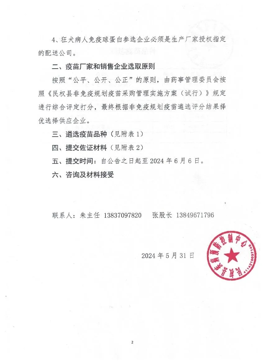 【商丘】民权县疾病预防控制中心2024年第二次非免疫规划疫苗厂家及品种选取公告