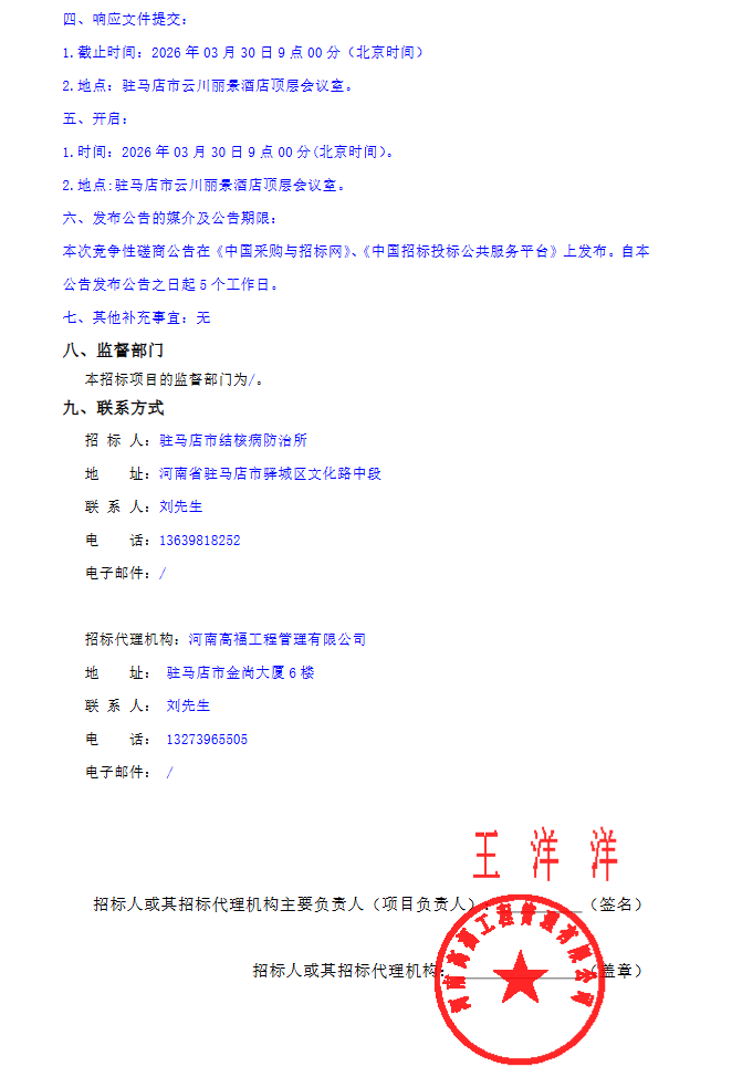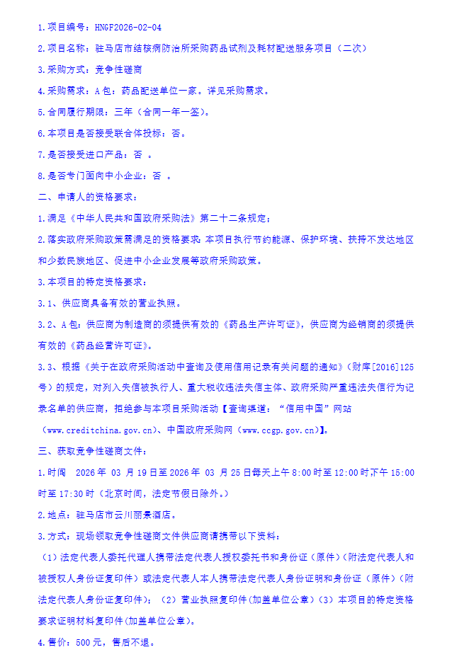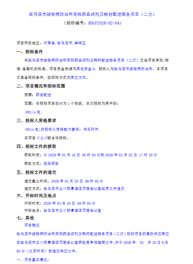 【驻马店市结核病防治所】河南省驻马店市结核病防治所采购药品试剂及耗材配送服务项目(二次)