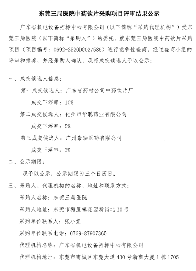 【东莞三局医院】广东省东莞三局医院中药饮片采购项目评审结果公示
